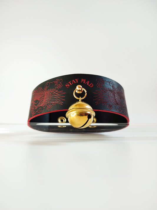 Genuine Leather Irezumi Bell Choker • Maneki Neko • Red or Black • Adjustable • With Velvet Gift Bag • LOH