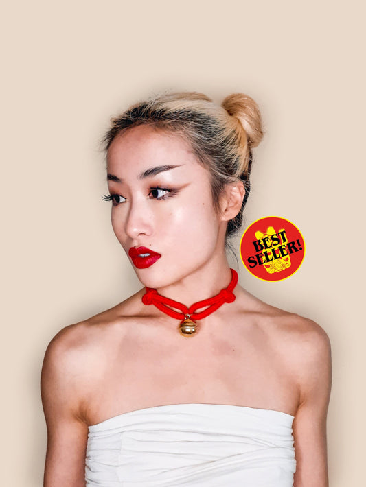 Rope Bell Choker • Maneki Neko • GOLD / SILVER & Red or Black • Magnetic • Adjustable • With Velvet Gift Bag • LOH